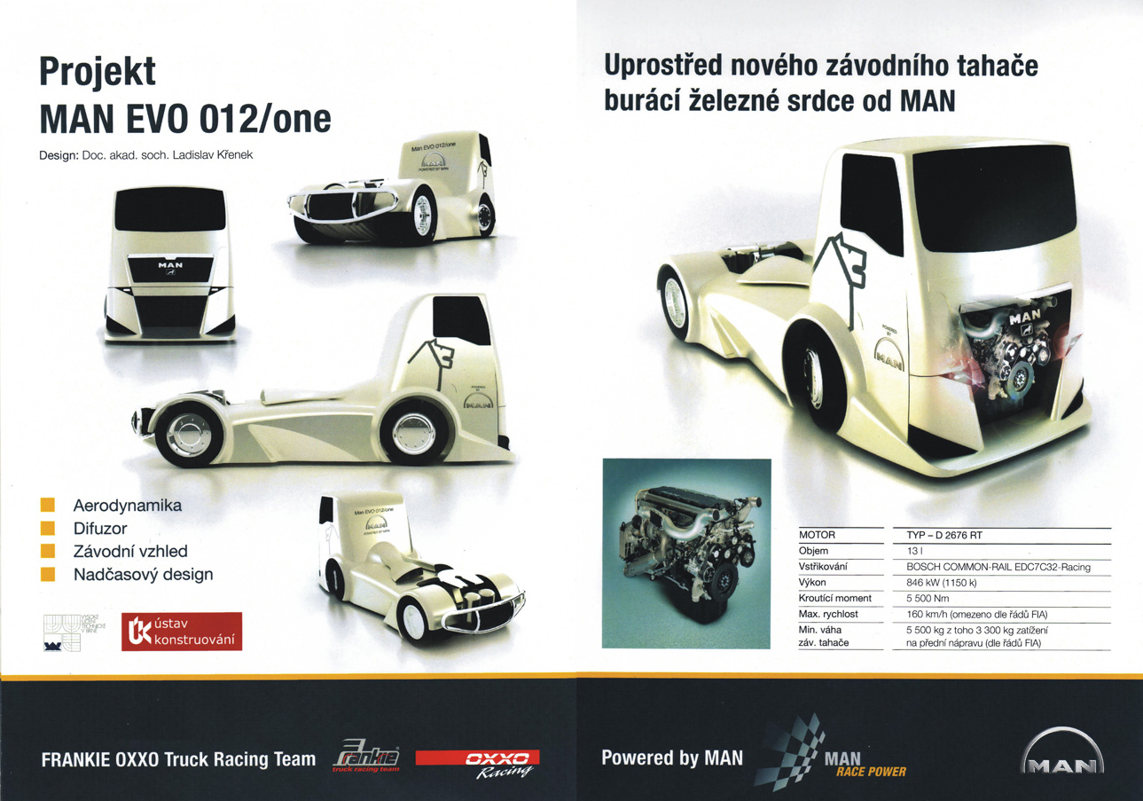V současné době finišují, za vydatné technické a materiální podpory společnosti MAN, v dílnách v Jablonci nad Nisou práce na stavbě tří speciálů MAN EVO 012/one, jejichž design je dílem doc. akad. sochaře Ladislava Křenka z Odboru průmyslového designu ÚK FSI. Projekt koncepčního řešení designu závodního trucku vznikl na FSI VUT pod záštitou nově zřízeného Centra nových technologií pro strojírenství – NETME a jeho prvořadým cílem je snaha vnést do prostředí okruhových závodů tahačů novou kvalitu i z pohledu výtvarně technických parametrů. Proto komplexní návrh designu závodního trucku v sobě integruje i některé technické prvky, jako řešení aerodynamiky nebo chlazení motoru a brzd. Jedním z požadavků Františka Vojtíška v zadání pro designérskou studii bylo i vytvoření dojmu monopostu F1 v bočním pohledu na spodní ponton vozu bez kabiny, což snad podařilo v rámci omezujících kritérií bezezbytku splnit.