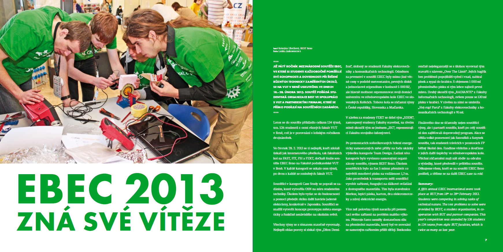 Již pátý ročník mezinárodní soutěže EBEC, ve které si studenti každoročně poměřují své schopnosti a dovednosti při řešení různých technicky zaměřených úkolů, se na VUT v Brně uskutečnil ve dnech 18.-28. 2. 2013. Soutěž pořádá studentská organizace BEST ve spolupráci s VUT a partnerskými firmami, které se přímo podílejí na soutěžních zadáních.