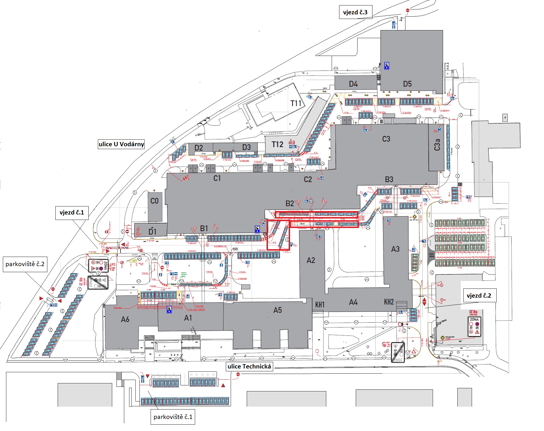 Pro vjezd jeřábu a kamionu s materiálem jsme nuceni přistoupit k omezení parkovacích ploch. Konkrétně jde o místa před severním nárožím budovy B1 a všechna místa mezi budovami B2 a A2, viz přiložený plánek.