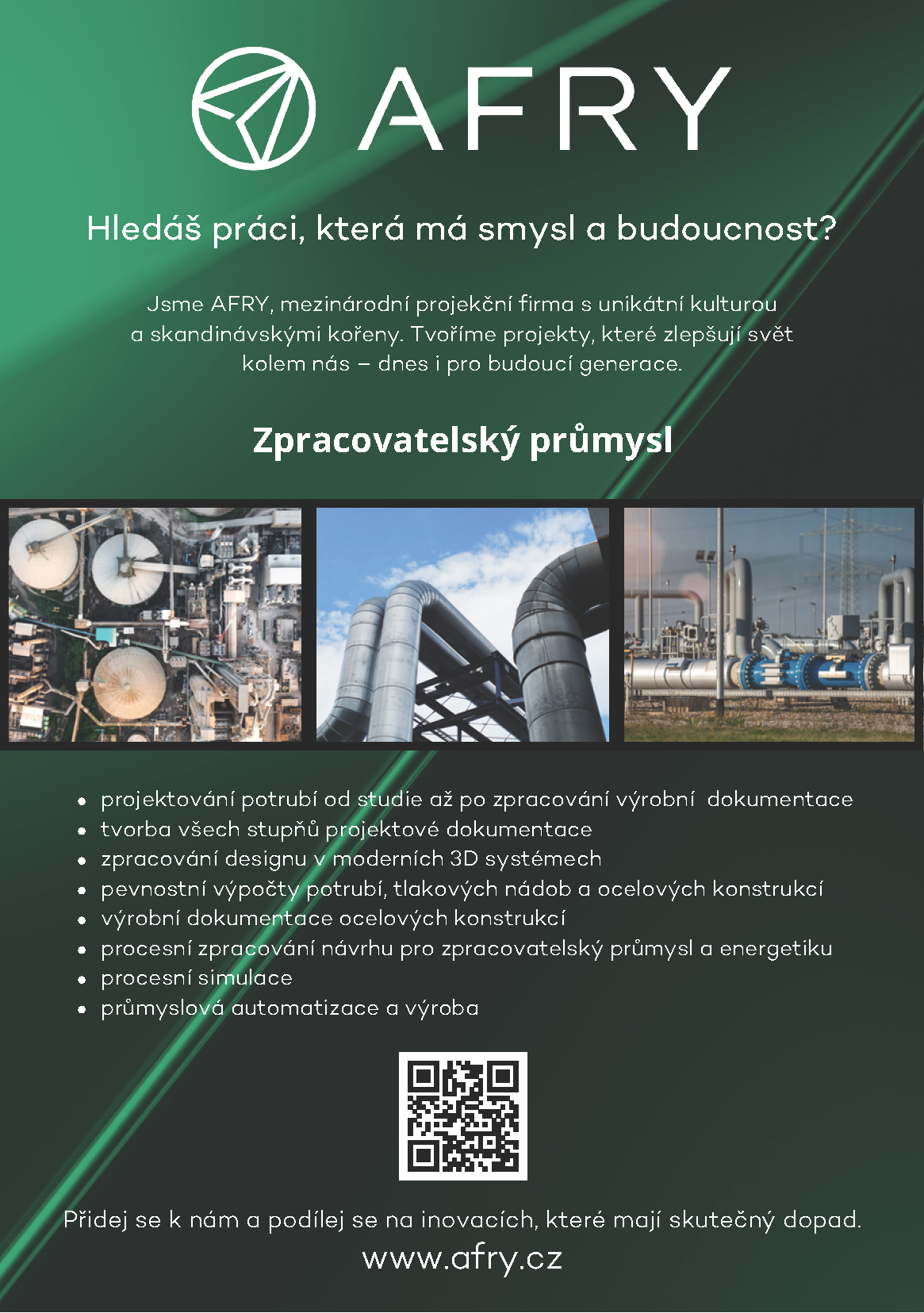 AFRY poskytuje inženýrské, projektové a poradenské služby, které napomáhají energetické a průmyslové transformaci a zvyšování odolnosti společnosti. Díky 18 000 expertů po celém světě propojujeme globální dosah se znalostí místního prostředí a odborností v jednotlivých sektorech s cílem vytvářet trvalou hodnotu pro budoucí generace.