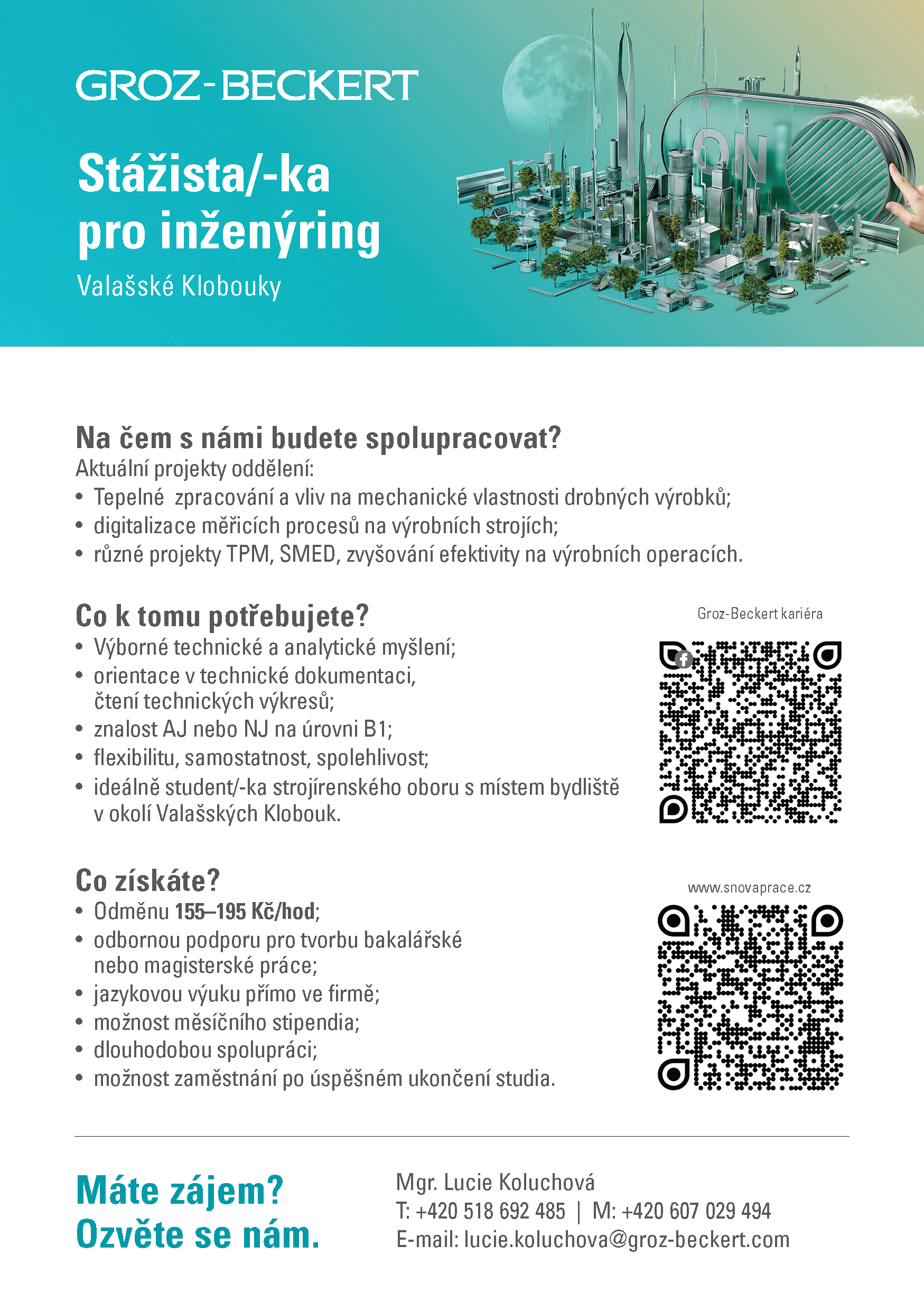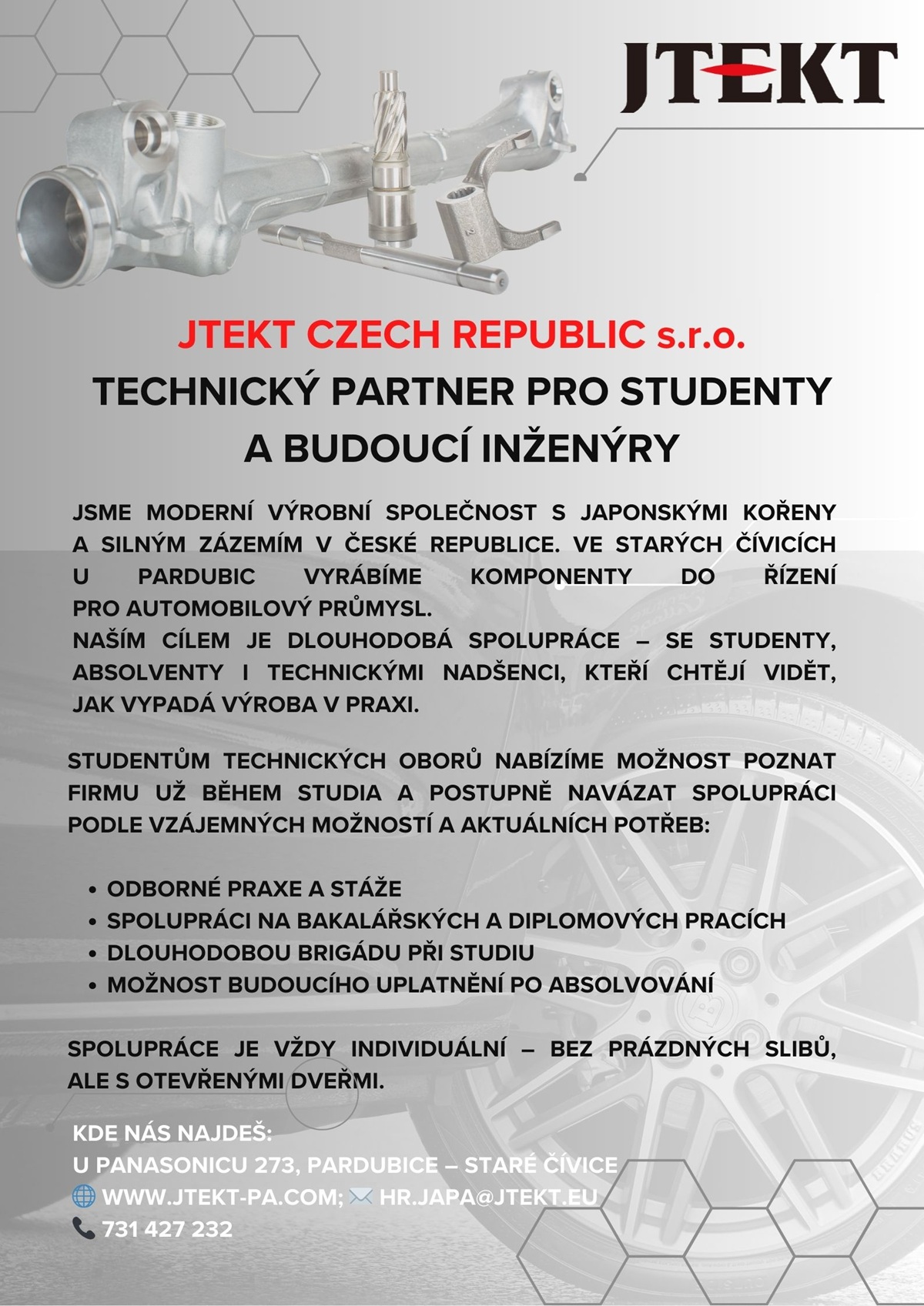 Uplatnění u nás najdou motivovaní studenti a absolventi, které zajímají tyto oblasti: Management kvality, Konstrukce, Technologie, Výroba, Průmyslové inženýrství, ESG, IT, HR