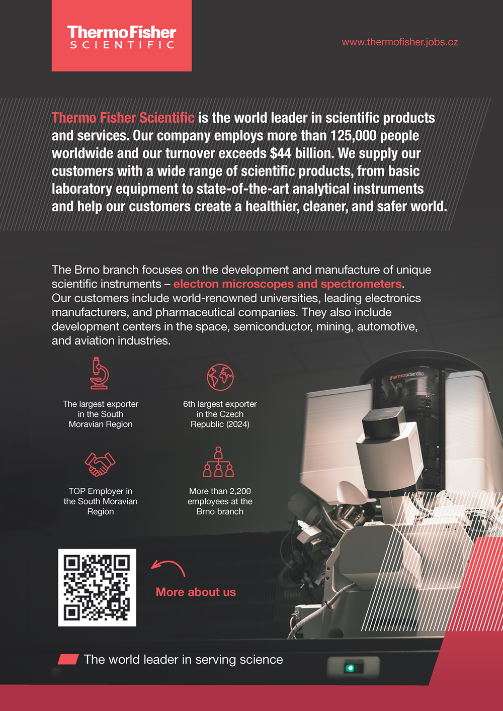 Thermo Fisher Scientific je světovým lídrem v oblasti produktů a služeb určených pro vědu. Brněnská pobočka se zaměřuje na vývoj a výrobu špičkových elektronových mikroskopů a spektrometrů. Mezi naše zákazníky patří světově proslulé univerzity, přední výrobci elektroniky, farmaceutické firmy, polovodičové a letecké společnosti, a mnoho dalších. Díky naší práci pomáháme vytvářet svět zdravější, čistší a bezpečnější.