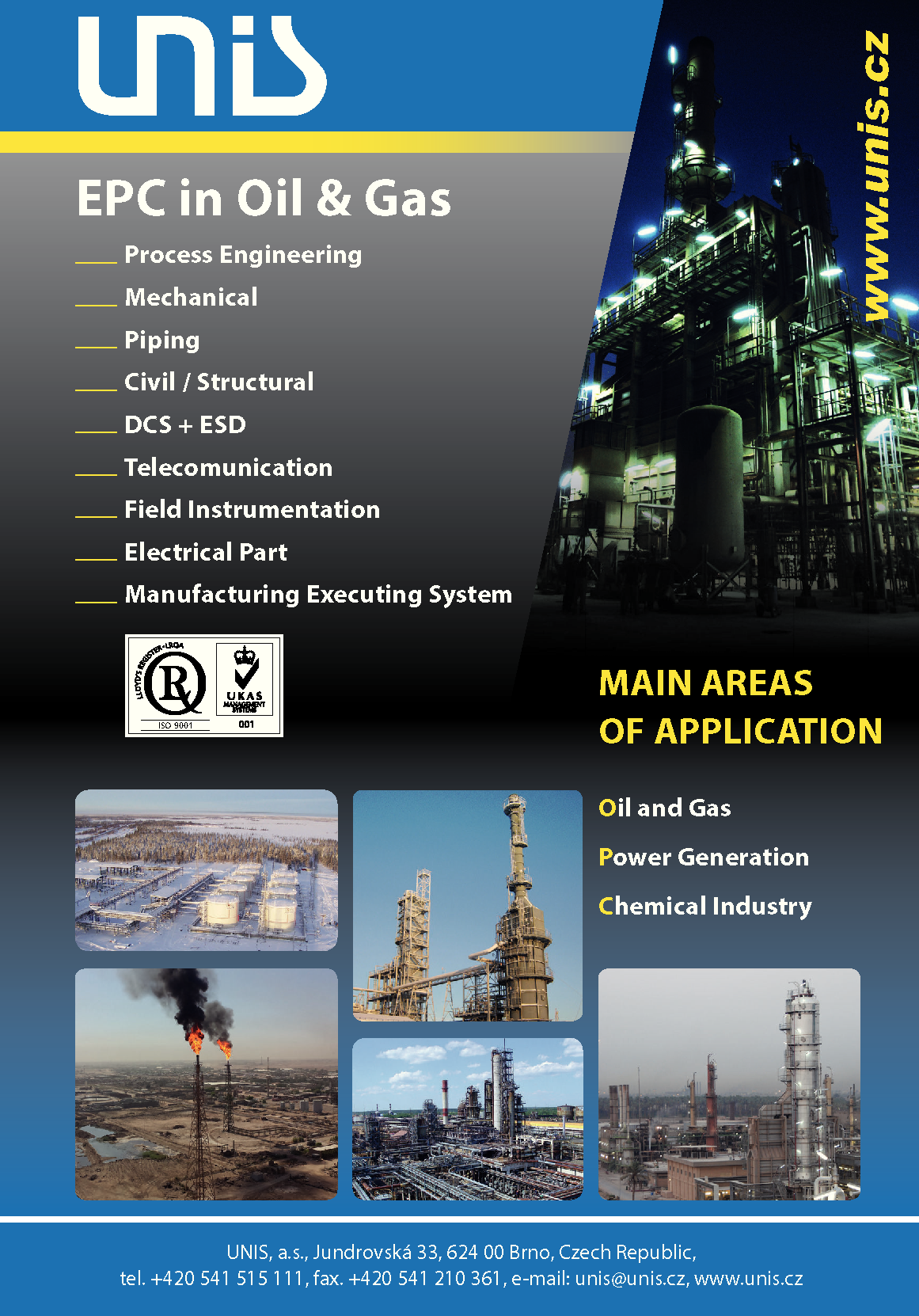 Hlavní činností UNIS, a.s. je realizace projektů v investiční výstavbě zaměřené do oborů zpracování ropy a zemního plynu, chemie a energetiky v dodavatelské formě tzv "na klíč"(model EPC nebo EPC-M). UNIS se může také pochlubit činnostmi v oblasti letecké techniky. Divize letecká se specializuje na vývoj, testování a výrobu elektronických řídících systémů pro letectví a obranu.Pokrýváme celý životní cyklus produktu od návrhu, ověřování, typové zkoušky až po sériovou výrobu.Navštivte náš stánek č. 26 ve středu 4. 3. 2026.