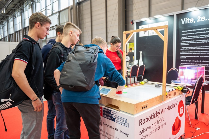 V rámci doprovodného programu jsme představili fakultní týmy i práci našich výzkumníků. Nechyběly mechatronické modely, aktivity strojLabu, letouny týmu Chicken Wings. Středoškoláci si mohli vyzkoušet porazit neviditelného protihráče ve vzdušeném hokeji, projet se na závodní dráze v simulátoru studentské formule, vyzkoušet virtuální realitu či ovládání malého vozítka na stlačený vzduch označeného jako Pneuracer i obdivovat pneumobil.