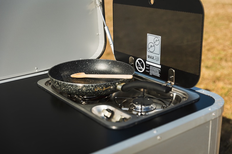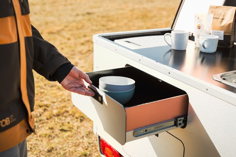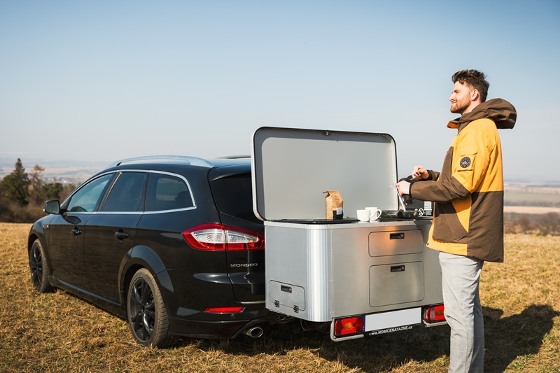 Box je univerzální a lze jej dát za téměř jakékoliv auto, které má tažné zařízení do 80 kilogramů. „Nabízíme celkem tři varianty boxu. Základní obsahuje sporák, samotný box, kde jsou i dva šuplíky a úložný prostor pro plynovou bombu a kanystr s vodou, a samozřejmě nosič a dodání. Střední varianta obsahuje i lednici. A pak máme prémiovou verzi, kde lze vybírat z 19 barev boxu, plus obsahuje kempovací zásuvku a osvětlení pracovní plochy. Cenově se pohybujeme od 60 do 80 tisíc korun, podle výbavy. Spotřebiče jsme vybrali v nejvyšší kvalitě, a to jak kvůli designu, tak především životnosti,“ popisuje Kubín.
