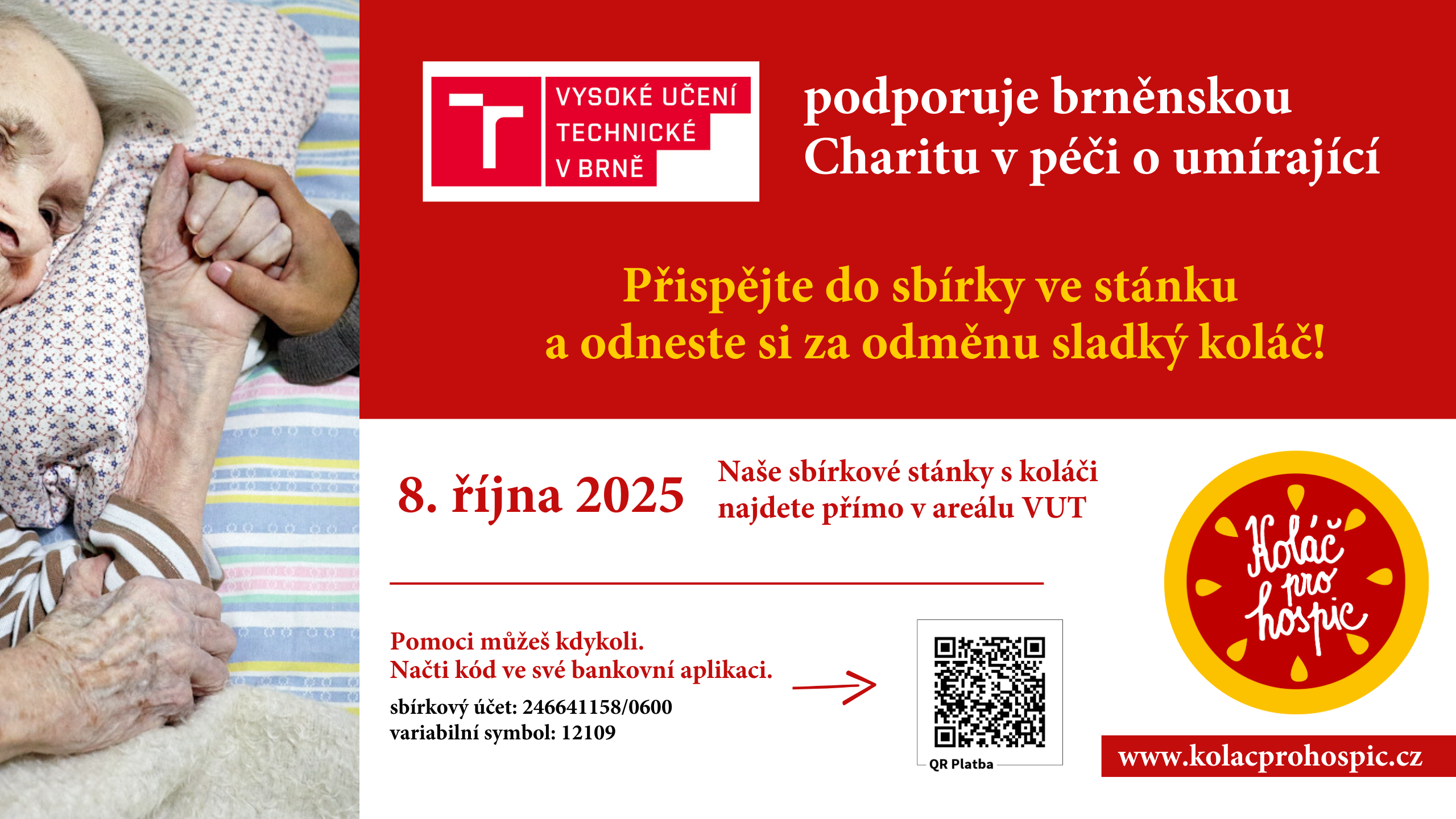Brněnská technika se již tradičně 8. října zapojí do akce Koláč pro hospic pořádané Diecézní charitou Brno. Přispěním na sbírku částkou 50 Kč a výše můžete podpořit hospicovou péči, odměnou vám bude sladký koláč.
