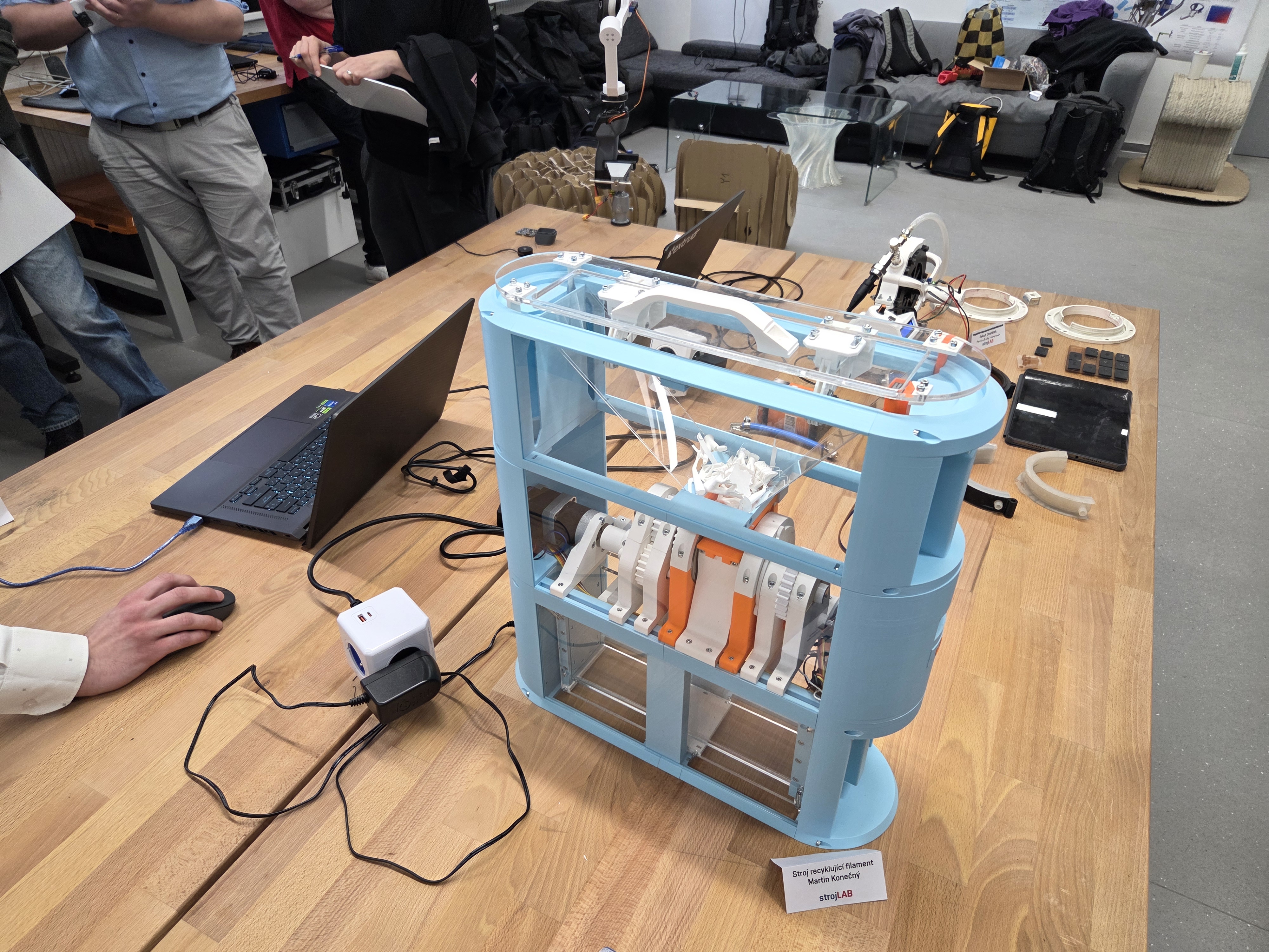 A tak se na závěrečném hodnocení projektu objevila opravdu velmi pestrá paleta zařízení. "Studenti představili například stroj pro recyklaci filamentu, automatický systém pro zavlažování pokojových rostlin, dávkovač na tekutou desinfekci, expediční meteorologickou mini stanici, víceosý kytarový pedál nebo pokojový koš na odpadky," popsal garant strojLABu David Škaroupka.