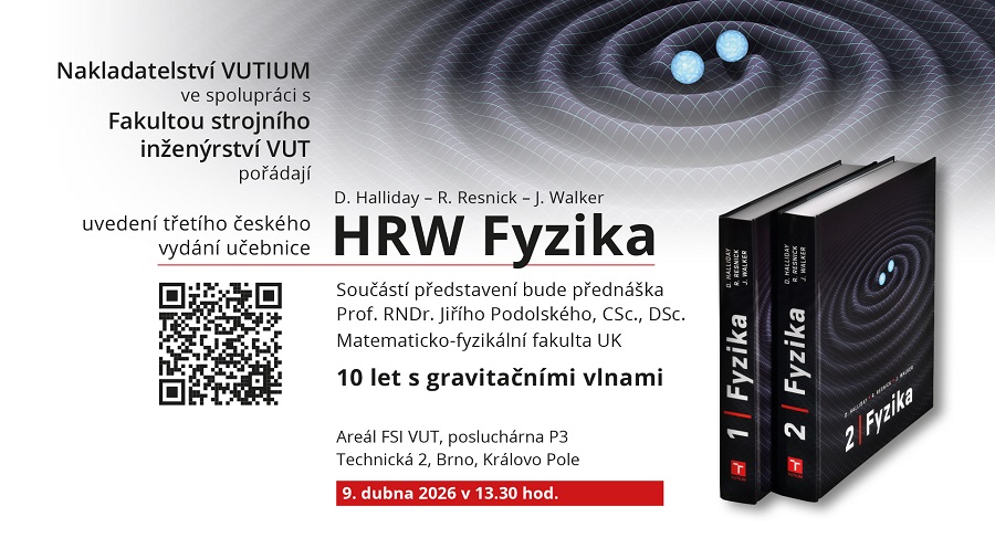 Fakulta strojního inženýrství VUT ve spolupráci s nakladatelstvím VUTIUM Vás srdečně zve na slavnostní uvedení třetího českého vydání ikonické učebnice HRW Fyzika (Halliday – Resnick – Walker). Tato publikace patří už více než půl století mezi nejuznávanější vysokoškolské učebnice fyziky na světě a pro generace studentů technických i přírodovědných oborů představuje jeden ze základních studijních pilířů.
