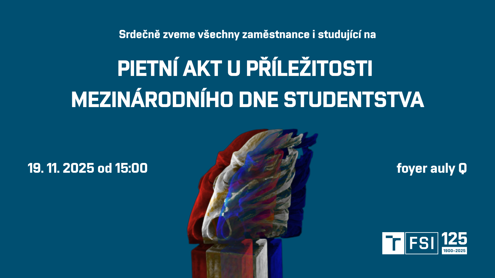 Srdečně zveme všechny zaměstnance i studující na pietní akt u příležitosti Mezinárodního dne studentstva, který se koná 19. 11. 2025 od 14:00 foyer auly Q. Setkání proběhne u sochy Jana Palacha „Oběť“, kterou vytvořil sochař a řezbář Jiří Netík.
