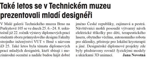 V Malé galerii Technického muzea Brno na Purkyňově 105 se ve dnech 25. 6.–24. 8. uskutečnil již 22. ročník výstavy diplomových prací studentů oboru průmyslového designu Fakulty strojního inženýrství VUT v Brně s názvem iD 25. Také letos byla témata diplomových prací mladých designérů, kteří sbírají i mezinárodní ocenění a nadále budou hájit dobré jméno České republiky, zajímavá a pestrá. Návštěvníci mohli posoudit výtvarný návrh elektrické tříkolky pro děti, terapeutického laseru, obytného včelína, autonomního robota pro skleníky, přístroje pro lokální kryoterapii a jiné. Designérské diplomové projekty zde byly představeny rovněž fyzickými modely a ukázkami 3D animací.