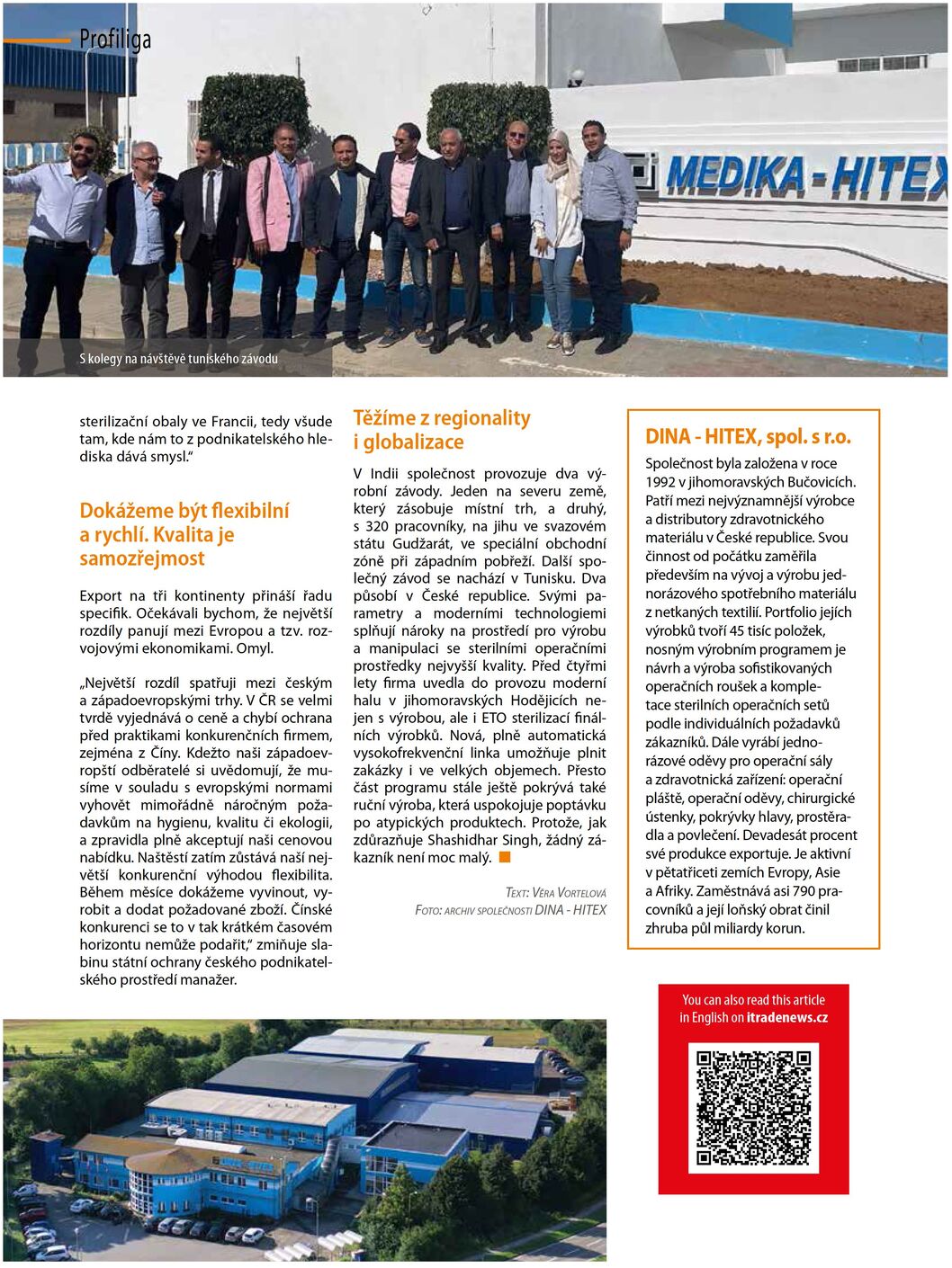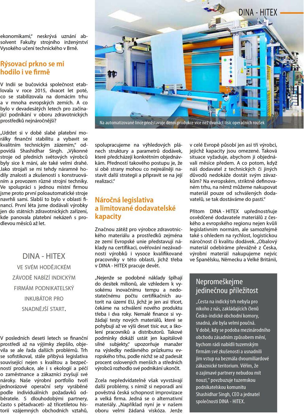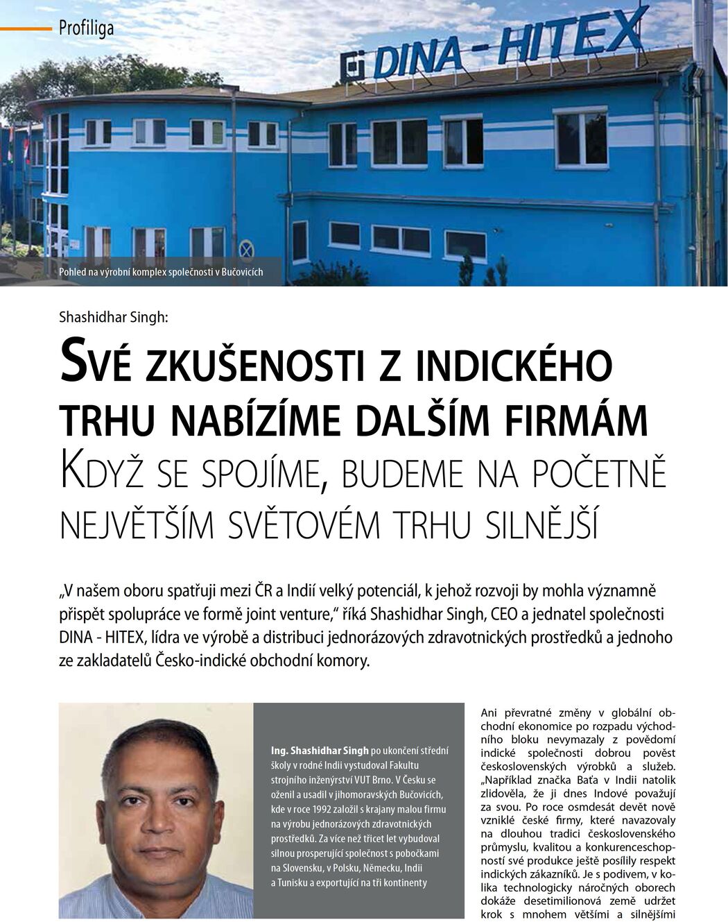 „V našem oboru spatřuji mezi ČR a Indií velký potenciál, k jehož rozvoji by mohla významně přispět spolupráce ve formě joint venture,“ říká Shashidhar Singh, CEO a jednatel společnosti DINA - HITEX, lídra ve výrobě a distribuci jednorázových zdravotnických prostředků a jednoho ze zakladatelů Česko-indické obchodní komory. Ani převratné změny v globální obchodní ekonomice po rozpadu východního bloku nevymazaly z povědomí indické společnosti dobrou pověst československých výrobků a služeb.