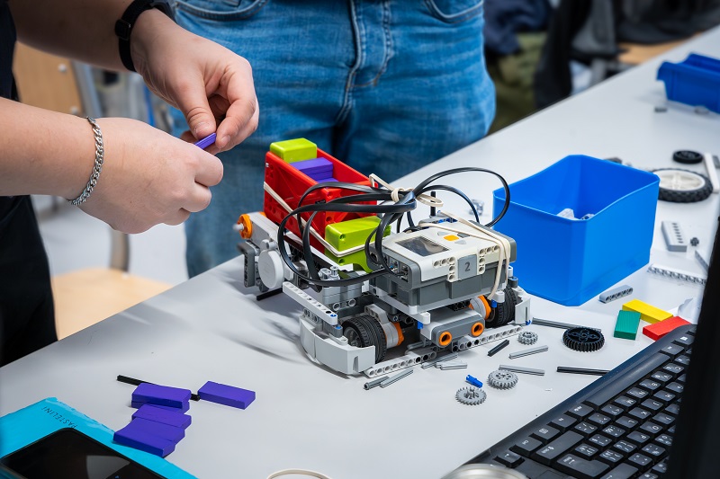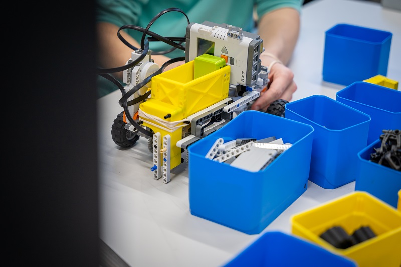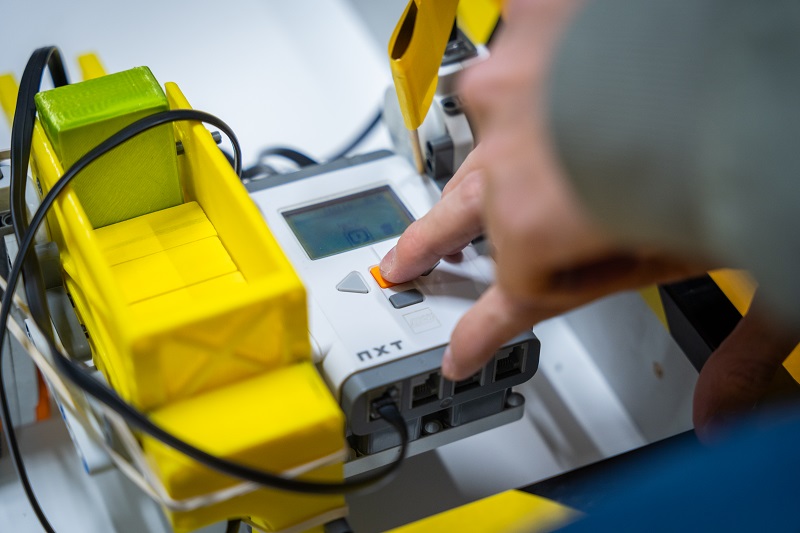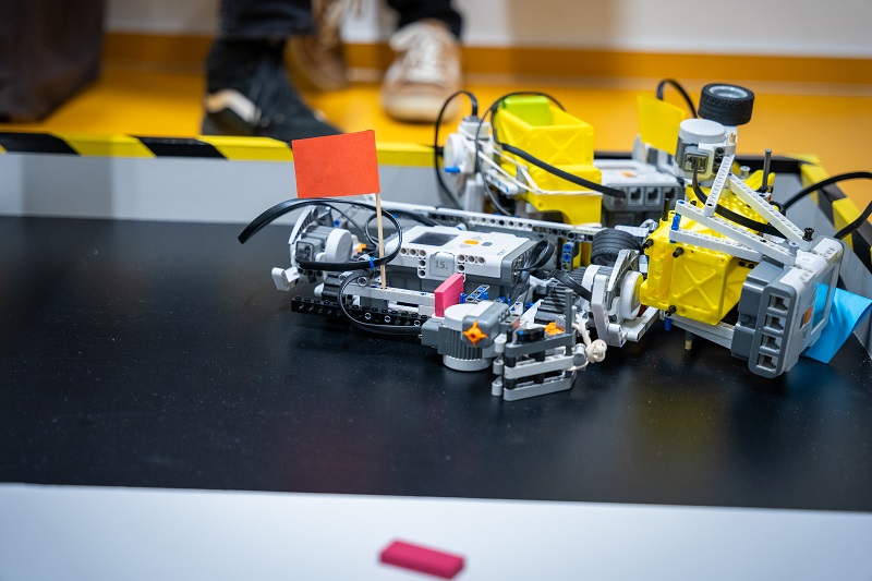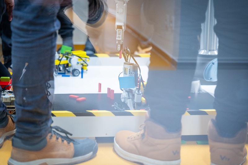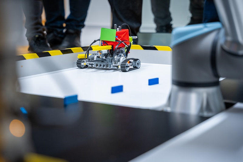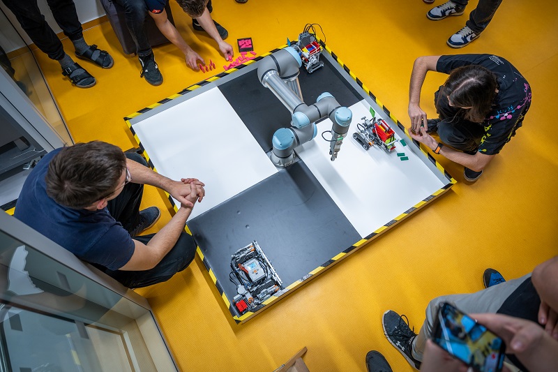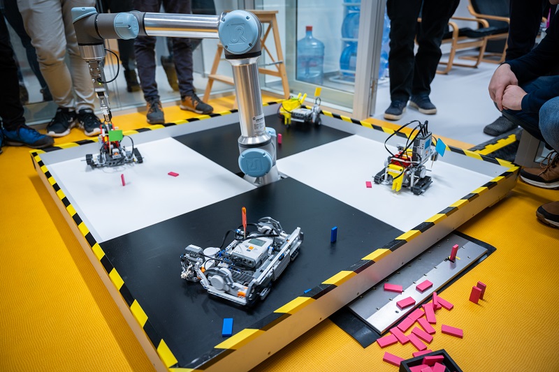 Odpoledne se týmy s hotovými roboty vrhly do finálových soubojů. Jejich součástí je obvykle i nějaký typ souboje a nejinak tomu bylo i letos. „Ze zkušenosti víme, že je díky tomu finále zábavnější. A přidali jsme kolaborativního robota jako ozvláštňující prvek,“ vysvětluje Richter a zároveň hodnotí letošní finálový úkol. „Zvolili jsme poměrně komplexní zadání. Ale sám jsem často překvapený řešením, se kterým studenti přijdou. V tomto případě je asi nejnáročnější mechanická část: přijít na to, jak položit kostičku domina, aby nespadlo, a zároveň se zorientovat v hracím poli,“ dodává.