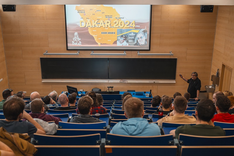 Ve stejný čas odstartovala v posluchárně P5 přednáška Davida Svídy z Ústavu automobilního a dopravního inženýrství, který se letošního závodu s kolegou přímo zúčastnil, a to v týmu Aleše Lopraise. Přednáška byla určena pro studenty a zaměstnance fakulty, tématem byla spíše technika závodního vozu než vlastní závod. Inženýři z ÚADI dlouhodobě pracují na vývoji motorů a dalších součástí pro tuto náročnou rallye. Přednáška byla součástí výuky předmětu Automobilové inženýrství.