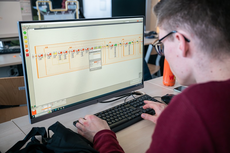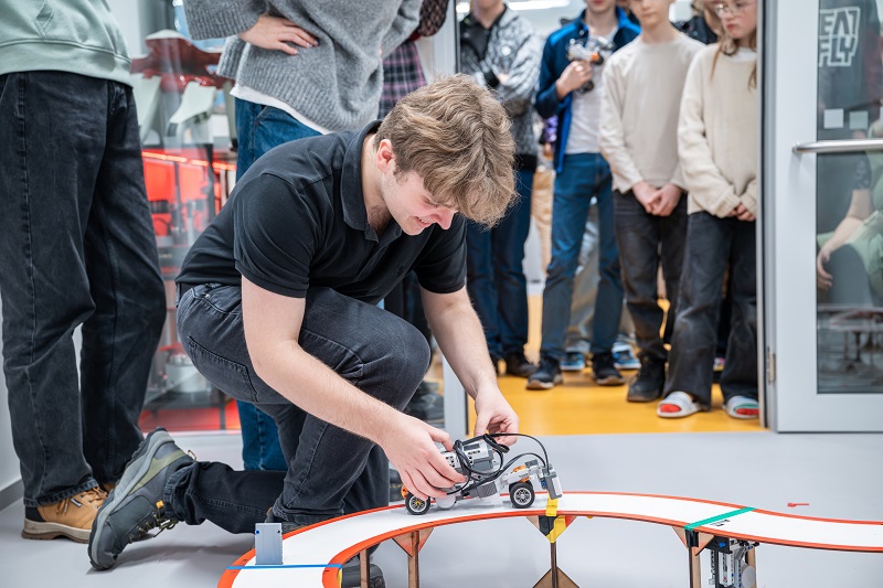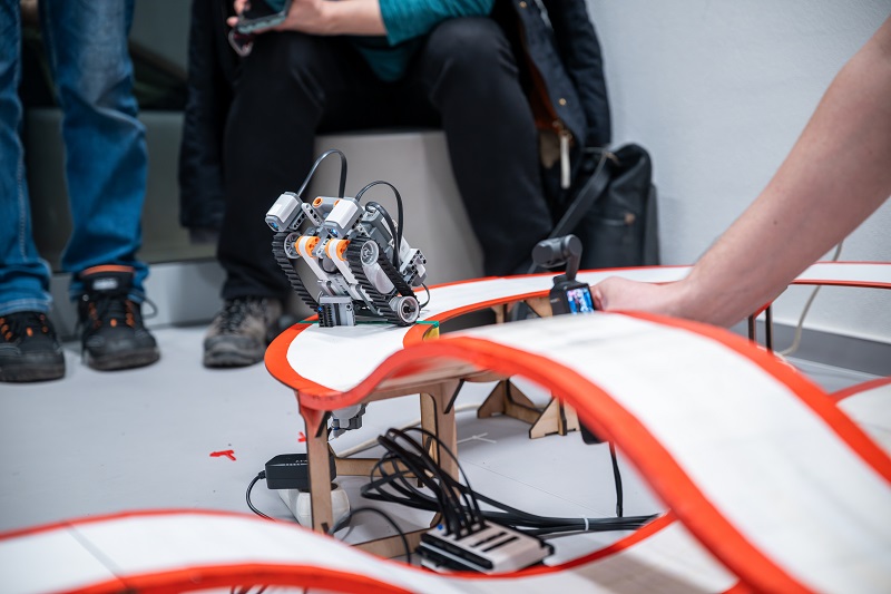 Za ní už studenti u závodní trati zkoušejí vychytat nedokonalosti svých zatím nehotových robotů, do finále tou dobou zbývají ještě dvě hodiny. „Máme zde vyvýšenou trať, po které budou roboty jezdit. Jezdí po jednom a každý tým má dvě minuty na to, aby ujel co nejvíce kol. Na trati je čekají překážky ve formě vyjíždějících stěn, kterým se musí vyhýbat, a také most a údolí, které musí zdolat. Myslím, že největší výzvou je právě kombinace tolika různých faktorů,“ hodnotí Karolína, která sama studuje na fakultě čtvrtým rokem mechatroniku.