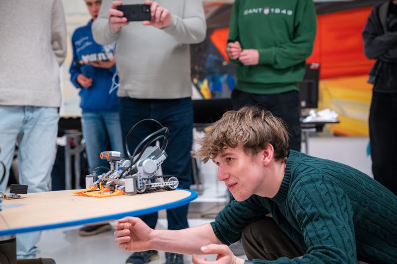 Mezitím si v předsálí dávají kávu učitelé, jejichž role je dnes nesnadná: mohou své týmy povzbuzovat, ale musí odolat pokušení pomáhat jim či radit. Dnes je to jen na studentech, jak si s úkolem poradili ukáží odpolední robotické souboje. „K vítězství vedou dvě cesty – buď vytlačit veškeré protivníky mimo plochu, nebo vydržet pět minut co nejblíže středu kruhu. Týmy se utkají ve třech skupinách po třech, z nichž pak vzejde finálová trojice,“ vysvětluje letošní výzvu pro mladé nadšence robotiky Jan Králík z Odboru mechatroniky.